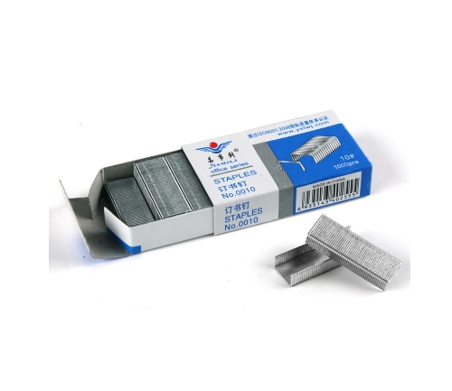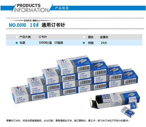 易事利订书针,采用优质高强度钢,尖头钉脚,易穿透纸张文件,装订更轻松,是工作、学习中订书机不可缺少的配件。